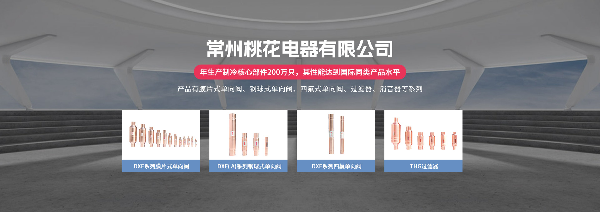 常州桃花電器有限公司地處中國長江“金三角”之稱的上海至南京高速公路、城際高鐵、常州高新經濟技術開發(fā)區(qū)路段,交通便利、技術力量十分雄厚。它是集研究、開發(fā)設計、制造和經營制冷核心部件的企業(yè),主要生產中央空調上使用的制冷部件。產品有膜片式單向閥、鋼球式單向閥、四氟式單向閥、過濾器、消音器等系列。年生產制冷核心部件200萬只,其性能達到國際同類產品水平。 企業(yè)擁有先進的科學技術、國際先進的生產加工設備和精密的檢測儀器,并已通過ISO9001質量體系及CE認證,公司歷史悠久,2000年起,經過長期積累、沉淀,經驗豐富,從而保證了產品的高質量、高性能、高耐用性。企業(yè)產品在國內外市場具有較高的知名度,深受眾多中外品牌制冷客商的好評。主要客戶有約克、麥克維爾、美的、開利、特靈、頓漢布什、清華同方、天加等.并出口北美、歐洲、東南亞等地區(qū)。 高品質產品是企業(yè)的保證,周到服務是合作友誼的承諾,企業(yè)本著“求